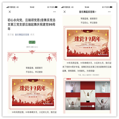 为庆祝中国共产党成立99周年,音乐舞蹈系党总支开展了“初心永向党,云端颂党恩”主题党日活动。各支部精心策划、认真组织,发挥专业优势,为党送上生日祝福。