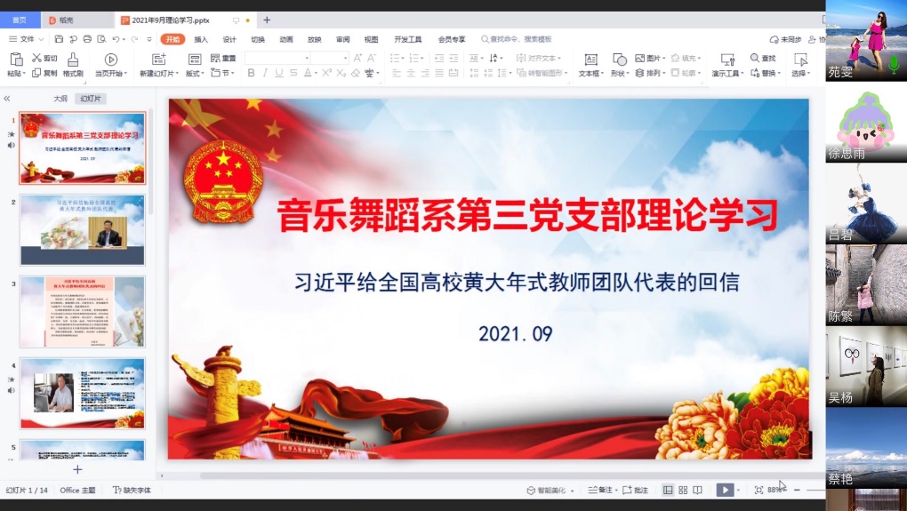 9月29日,音乐舞蹈系第三党支部组织党员进行线上理论学习,会议由第三党支部苑雯书记主持,支部所有党员师生参与会议。