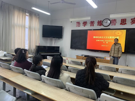 12月7日中午,太阳成集团122ccvip第二党支部书记马娟在碧螺校区D101开展以《推进社会主义文化繁荣兴盛》为主题的党课。本次党课围绕“文化自信是更基本、更深沉、更持久的力量;坚持用社会主义核心价值观凝心聚力;进行无愧于时代的文艺创造”三个方面展开阐述。