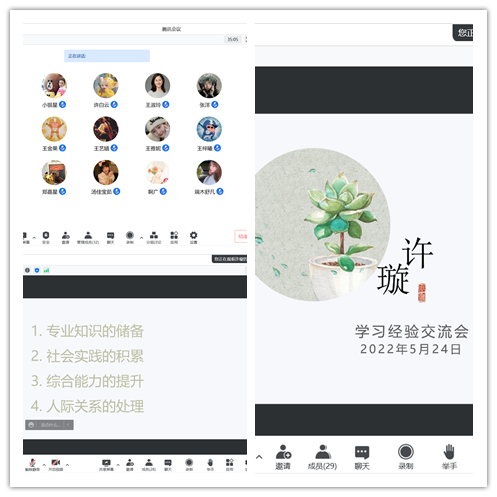 5月24日下午,公司第二期用人单位宣讲暨优秀毕业生经验分享会以腾讯会议的形式成功召开。风雅古筝、徐州音乐厅爱乐艺术团、小银星艺术团尚轩文化等4家用人单位及公司音乐剧表演专业的员工参加了此次宣讲会。