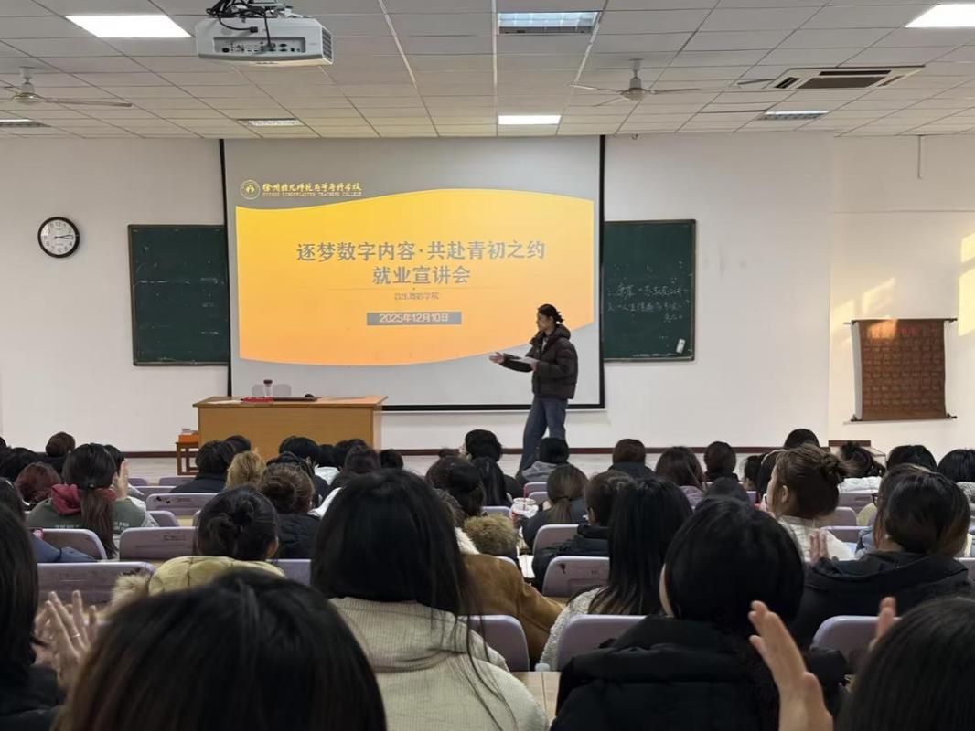 12月10日,太阳成集团122ccvip在碧螺校区知行楼二楼阶梯教室成功举办“逐梦数字内容,共赴青初之约”主题就业宣讲会。本次宣讲会特别邀请徐州青初文化传媒公司主讲,为公司学子精准推送适配岗位信息,搭建起专业人才与数字内容行业对接的重要桥梁。