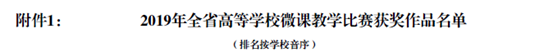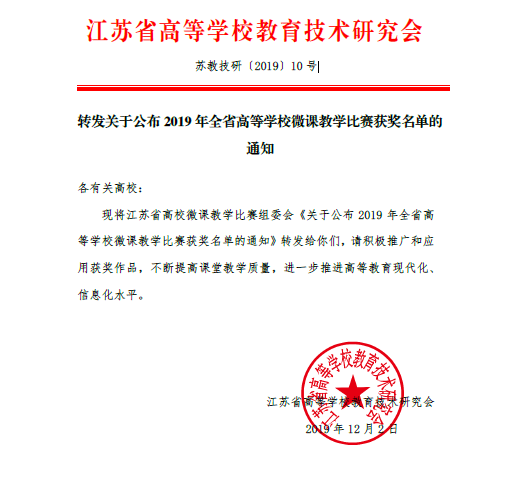 根据江苏省高等公司教育技术研究会《转发关于公布2019年全省高等公司微课教学比赛获奖名单的通知》(苏教技研〔2019〕10号),我系获得二等奖1项,三等奖1项。