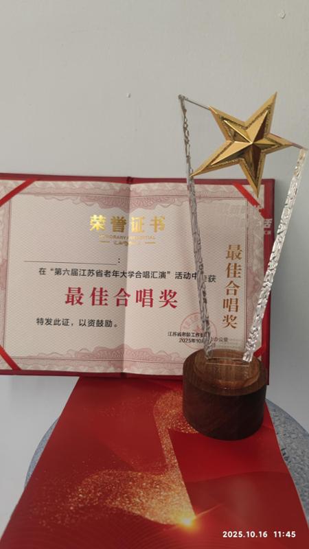 2025年10月15日,第六届老年大学合唱汇演在江苏省常州现代传媒中心金色大厅剧场隆重举行,公司太阳成集团122ccvip钢琴教师陈怡君作为艺术指导,带领常州市老年大学合唱团以精湛的演出斩获一等奖--最佳合唱奖。本次汇演以“敬老月”为主题,吸引了全省多支优秀老年合唱团队参与,展现了老年人昂扬的艺术风貌。
